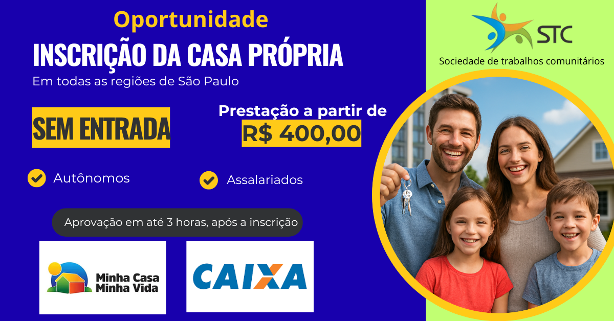 Somos uma parceria entre a STC – Sociedade de Trabalhos Comunitários, uma organização sem fins lucrativos dedicada ao desenvolvimento social, e a ABSANTOS Imóveis, especialista em habitação popular. Unimos experiência, compromisso e responsabilidade social para facilitar o acesso de pessoas e famílias de baixa renda à conquista da casa própria.